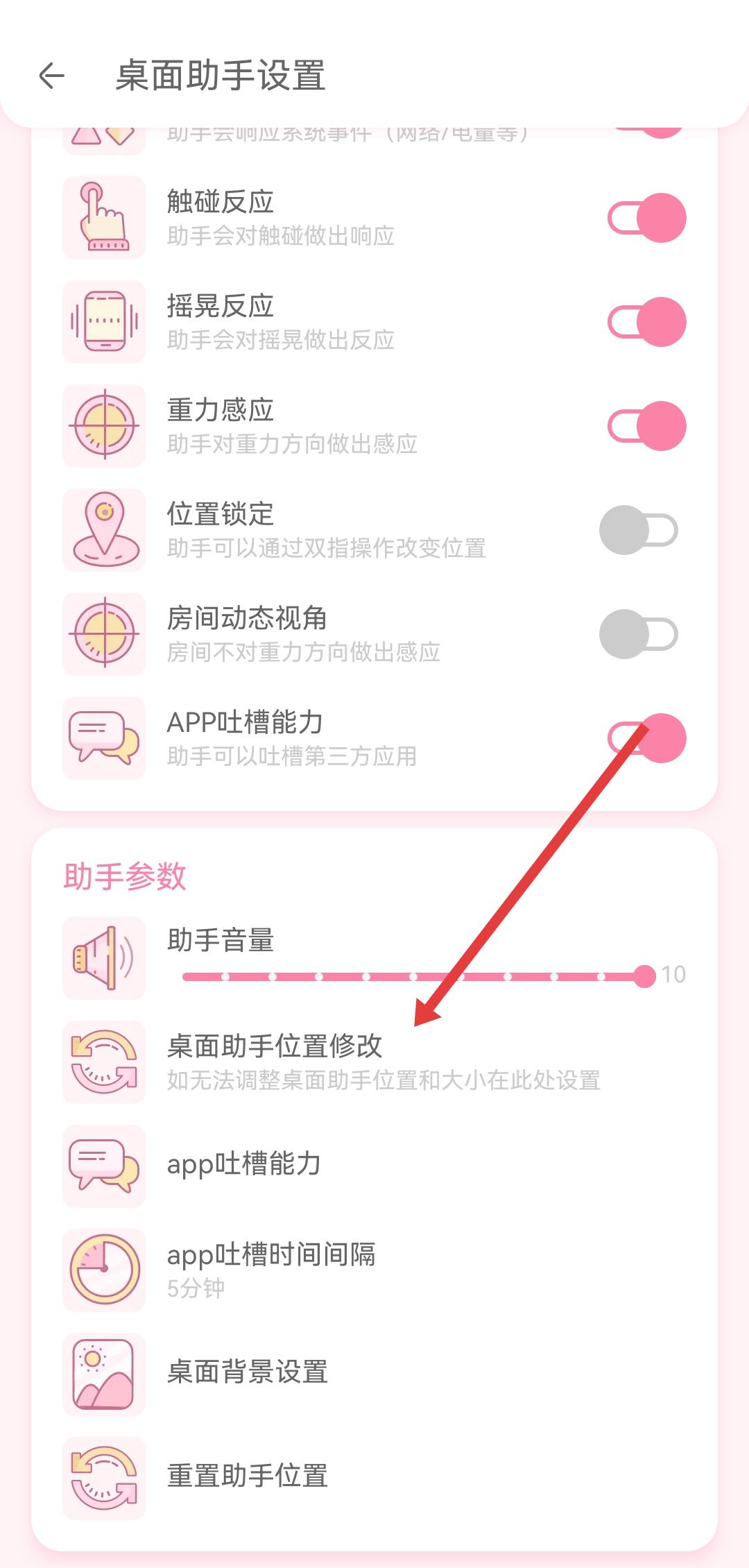 3、在桌面助手设置页面,找到并点击桌面助手位置修改选项,进入助手位置与大小调整页面。