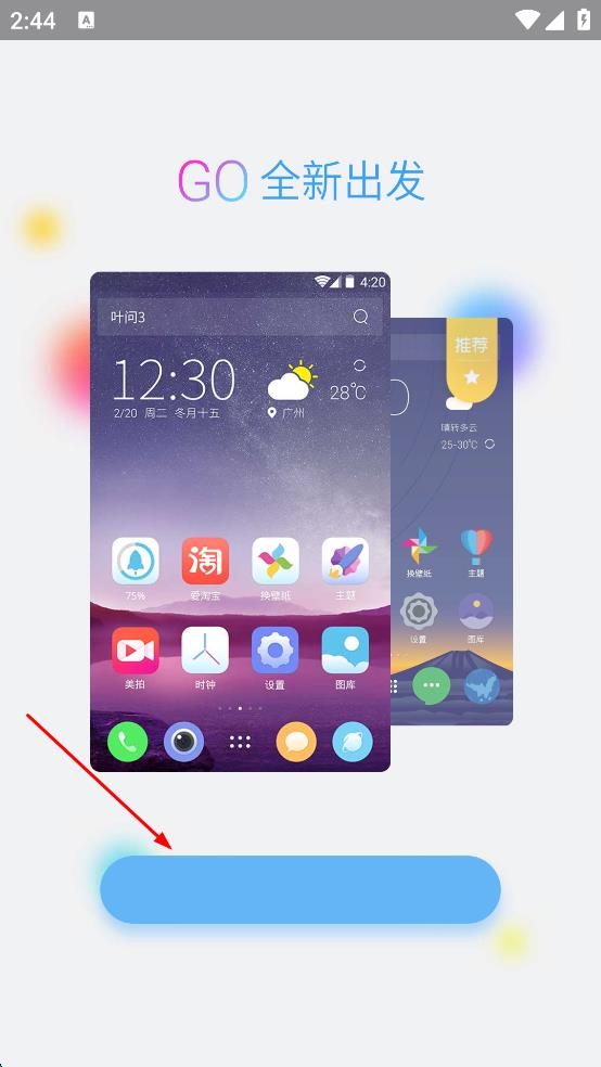 1、打开GO桌面应用,看到“GO 全新出发”界面,点击底部蓝色按钮,进入下一个引导页面。