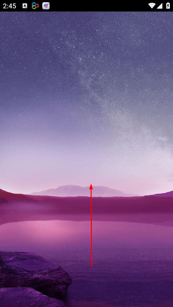 3、进入星空湖泊背景的桌面界面后,按照红色箭头指示方向,向上滑动屏幕,开始探索GO桌面功能 。