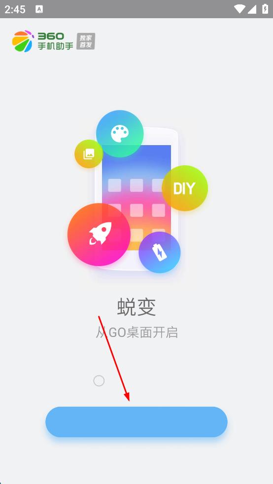 2、在“蜕变 从GO桌面开启”界面,继续点击底部蓝色按钮,完成引导步骤,进入桌面预览阶段。