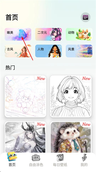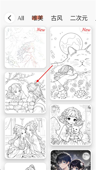 2、在唯美分类页面,选择感兴趣的涂色模板,进入涂色编辑页面。