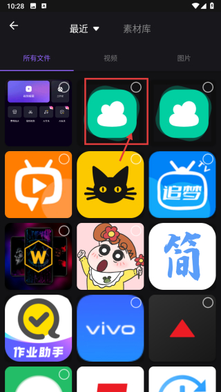 2、在素材选择页面,选择要编辑的视频素材。