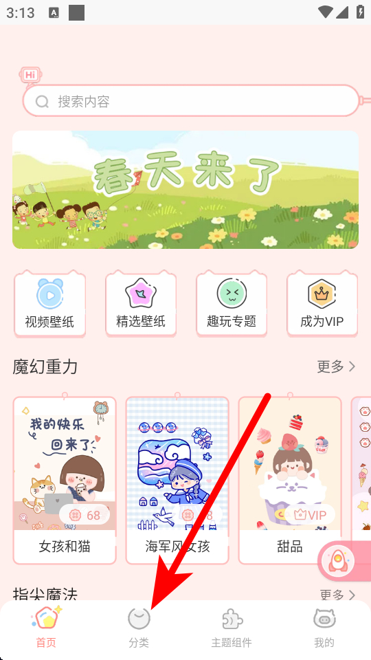 1、在主题应用首页,点击分类选项,进入分类页面。