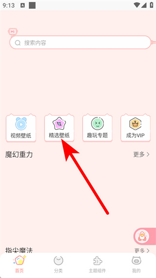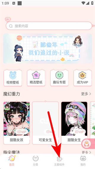 1、在趣玩桌面壁纸首页,点击下方主题组件选项,进入主题组件页面。