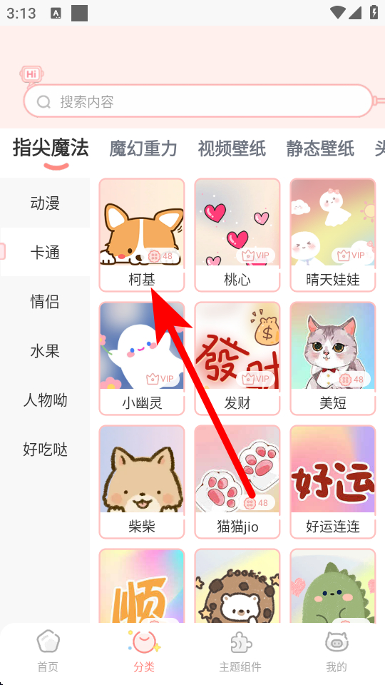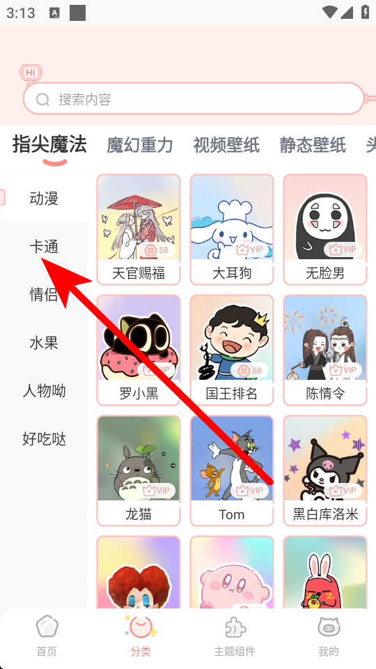 2、在分类页面,选择主题风格,如卡通,进入对应风格主题列表。
