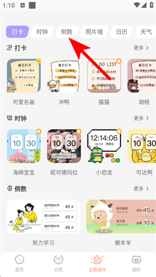 2、在主题组件页面,点击倒数选项,进入倒数组件列表。