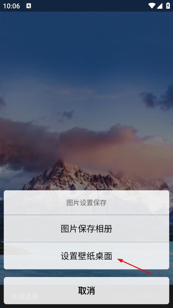 3、进入所选壁纸的详情页面后,会弹出操作选项,点击“设置壁纸桌面”选项,按照提示完成后续操作,将该壁纸设置为手机桌面壁纸。