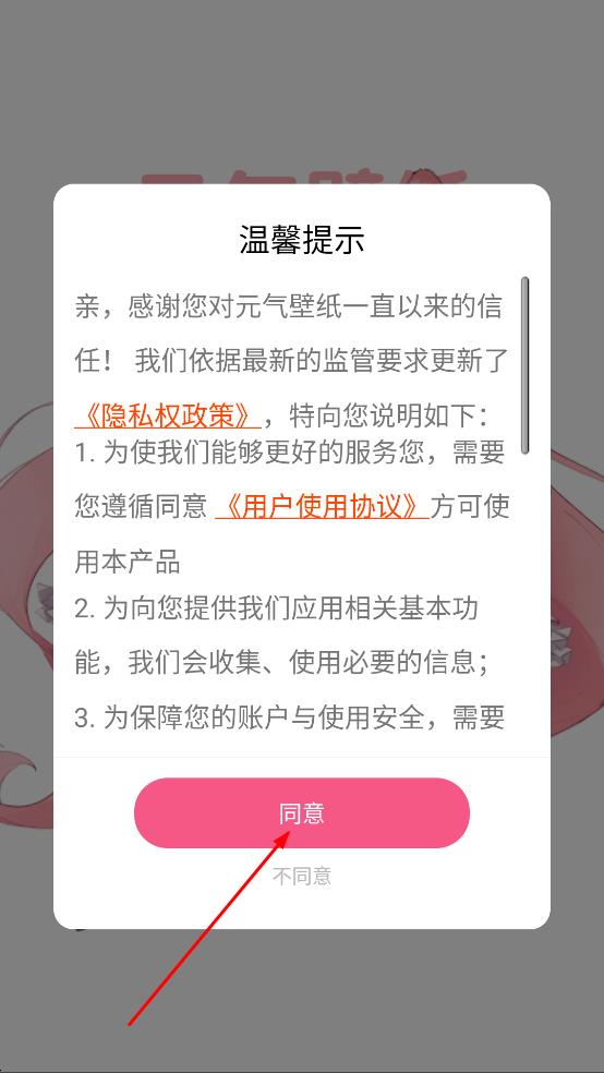 1、当温馨提示弹窗中,点击同意,进入元气壁纸主界面。