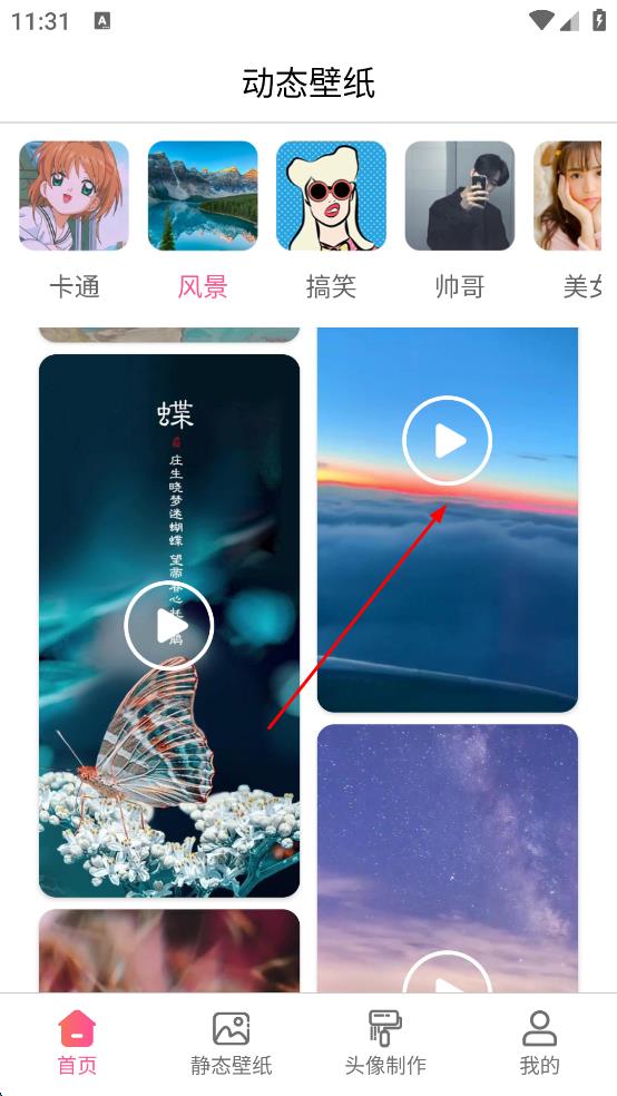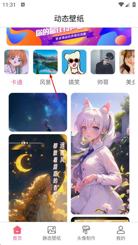 1、打开动态壁纸软件,进入主界面后,在上方的分类栏中,点击“风景”选项,切换到风景类动态壁纸展示页面。