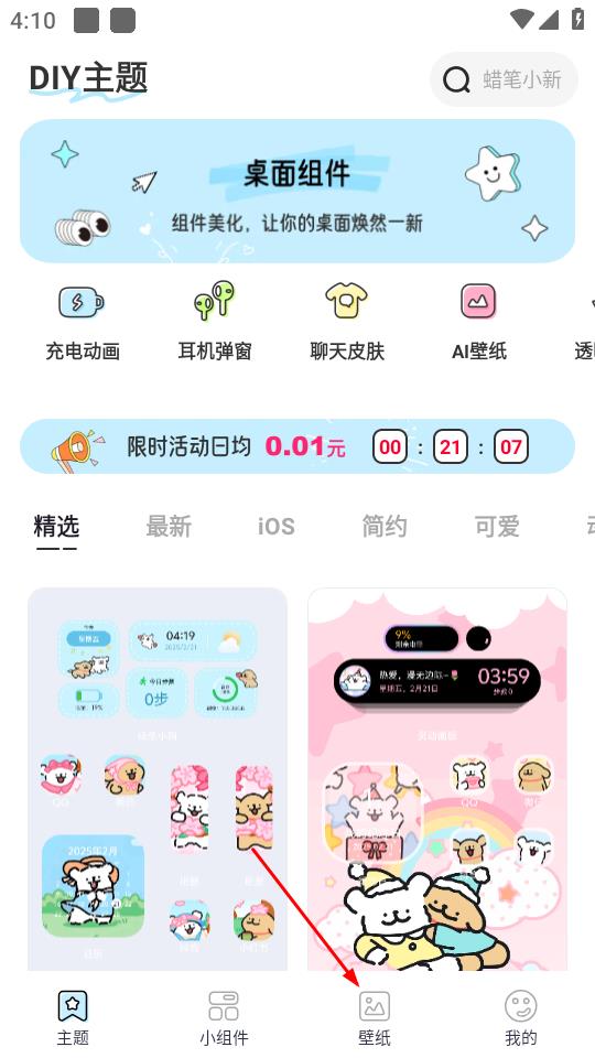 1、打开哈屏主题秀,点击页面底部的壁纸,进入壁纸页面。