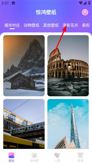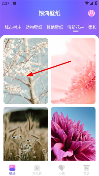 1、进入惊鸿壁纸后,点击清新花卉标签,可切换到对应风格的壁纸列表。