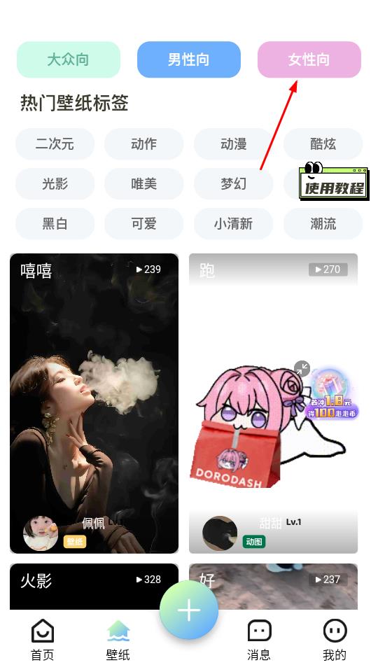 2、在壁纸页面,点击女性向选项,查看女性向壁纸。