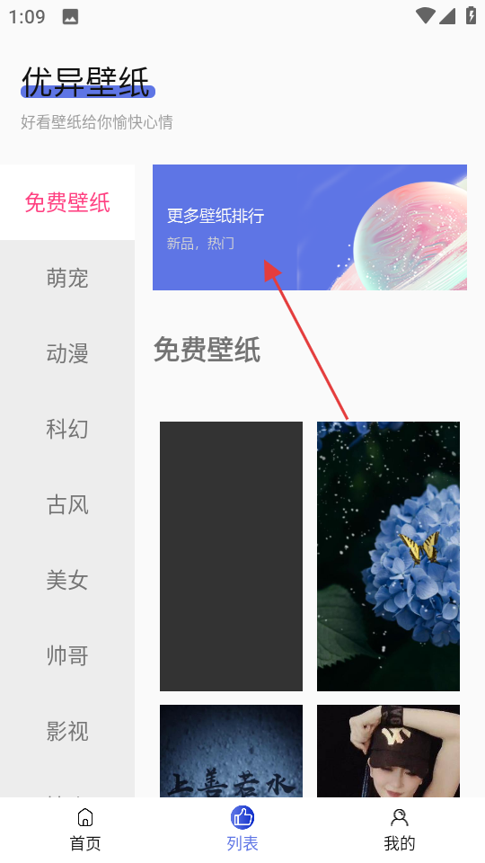 2、在列表页面,点击更多壁纸排行,进入为你推荐页面。