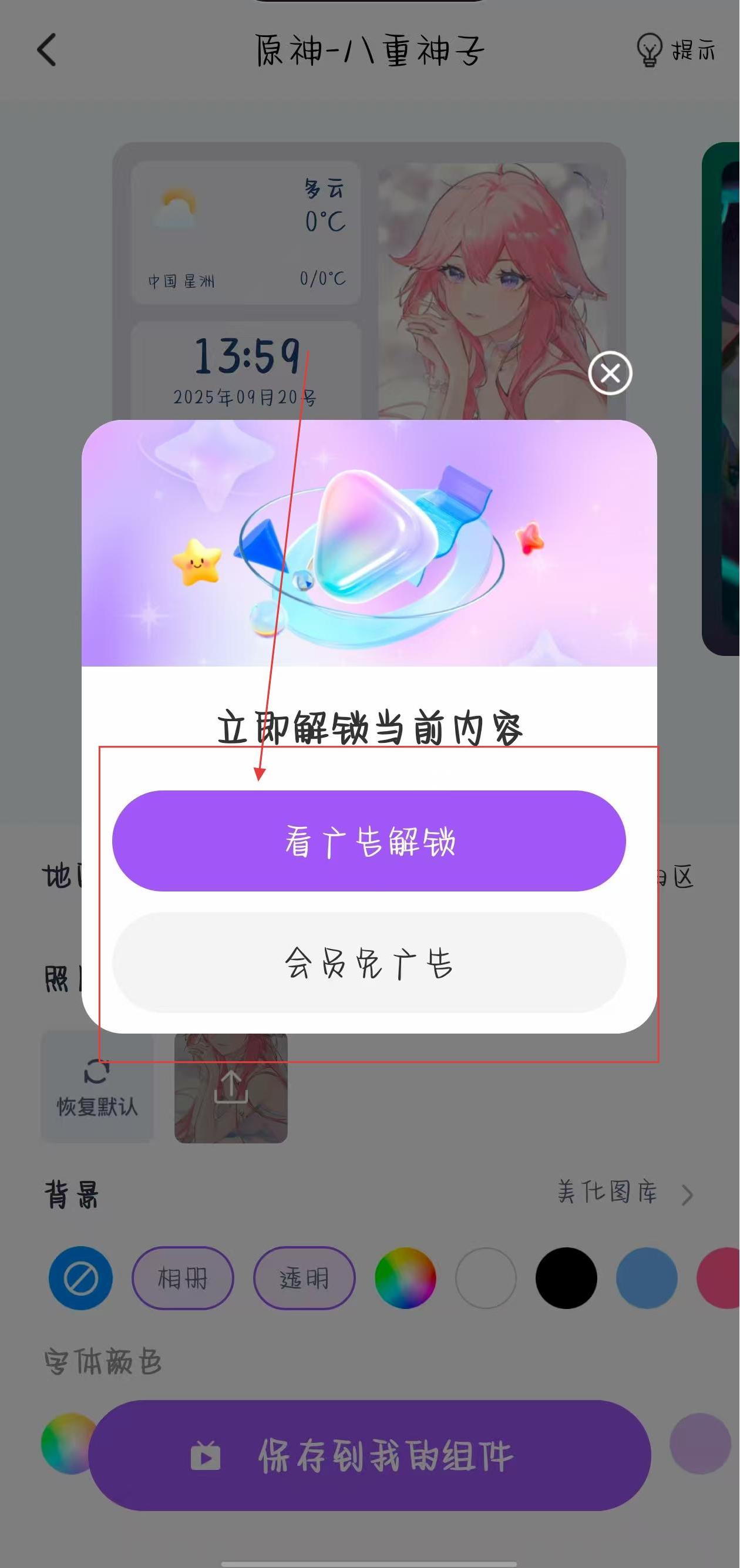 4、弹出提示框,可根据需求选择看广告解锁或会员免广告的方式解锁,解锁后即可成功保存。