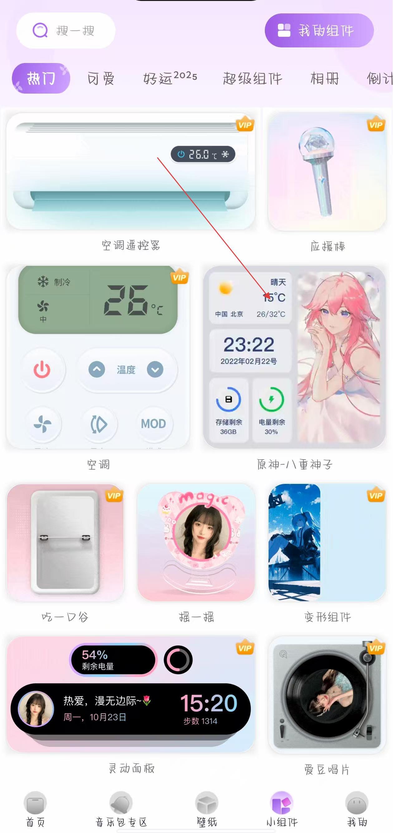 2、在小组件页面中,选择想要添加的小组件,点击该小组件。