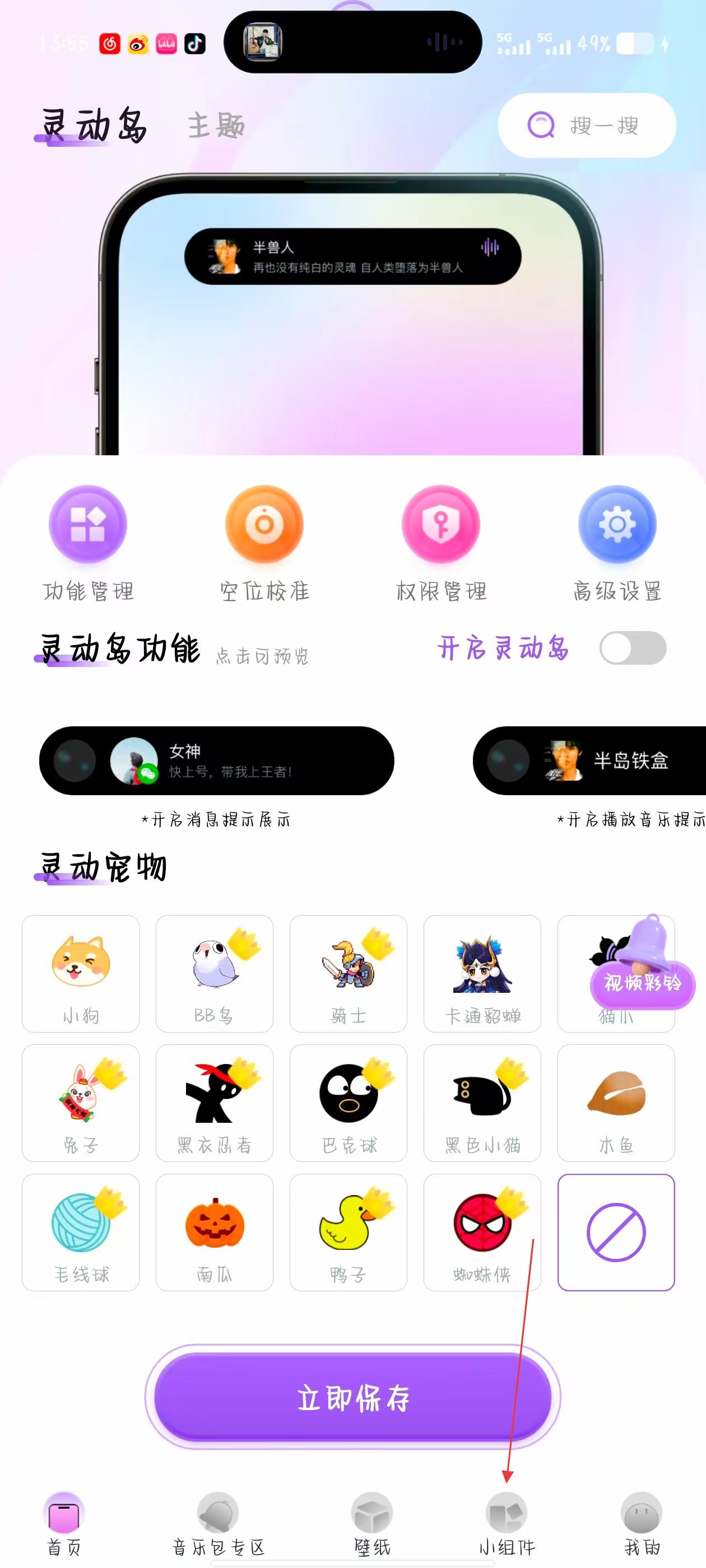 1、打开灵动坞应用,在首页点击底部导航栏的小组件选项,进入小组件选择页面。