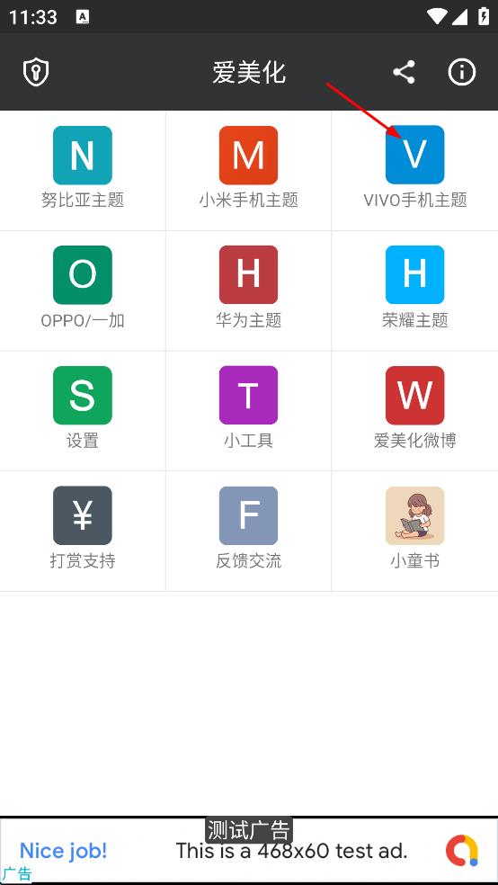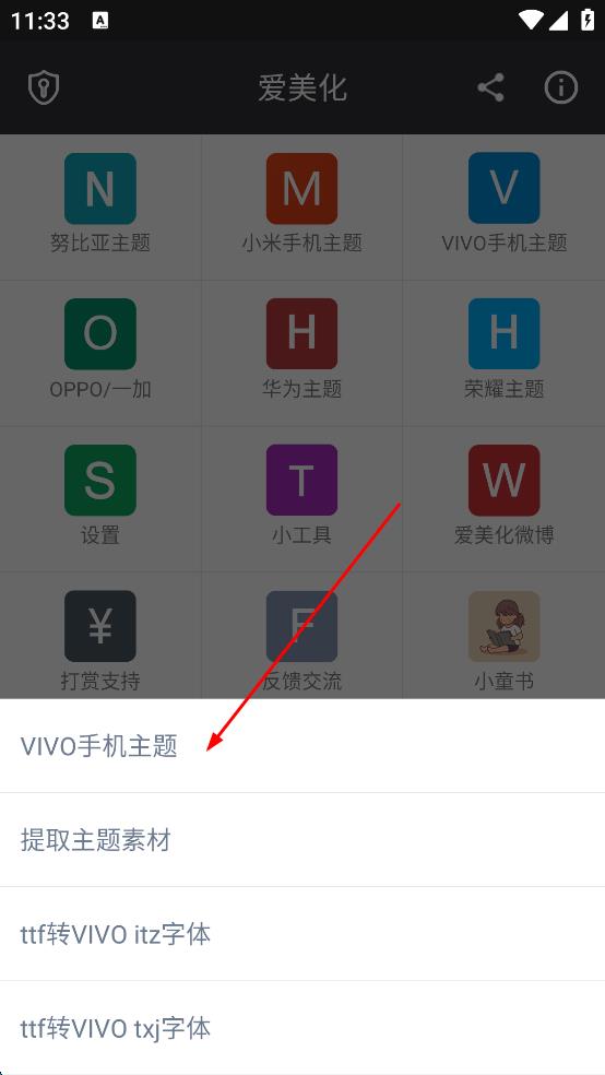 1、打开爱美化应用,在功能列表找到“VIVO手机主题”图标,点击进入VIVO主题操作界面。