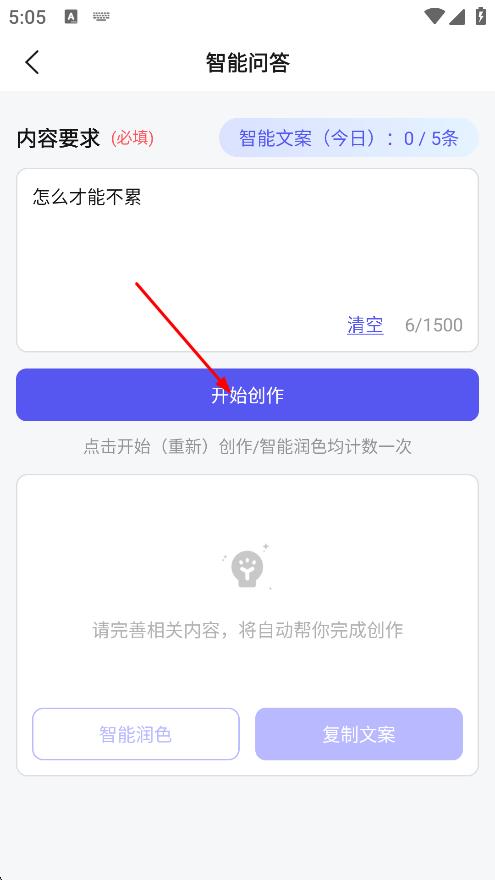 3、在创作页面,输入内容要求后,点击开始创作,生成问答内容。