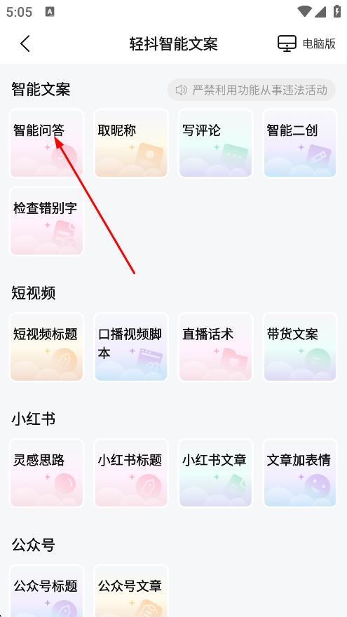 2、在轻抖智能文案页面,点击智能问答,进入智能问答创作页面。