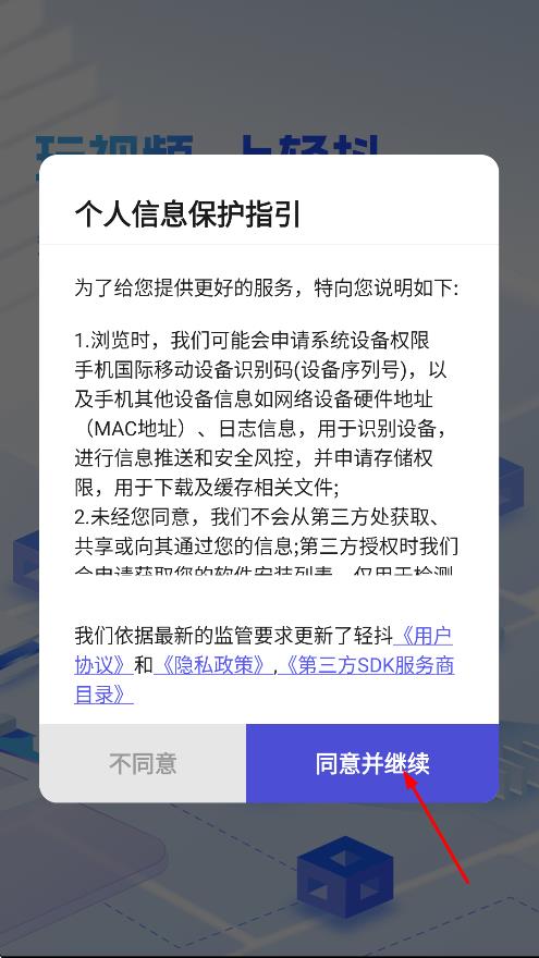 1、在个人信息保护指引弹窗中,点击同意并继续,进入应用页面。