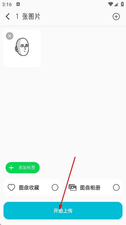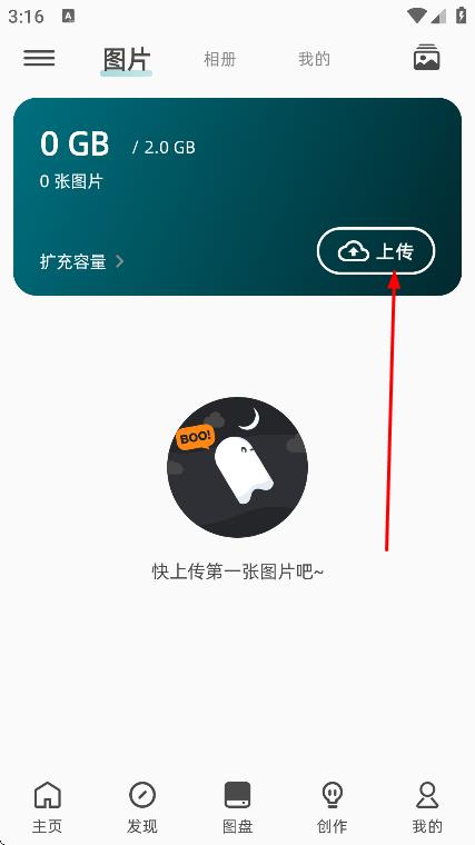 2、在图盘页面,点击上传,选择要上传的图片。