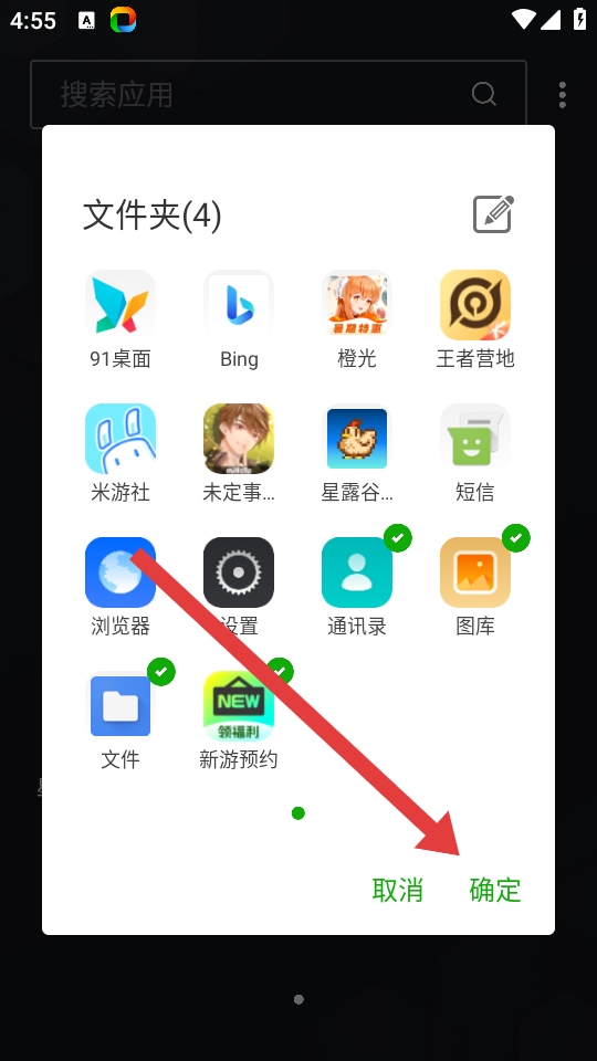 3、在文件夹编辑窗口中,勾选需要放入文件夹的应用,点击右下角确定。