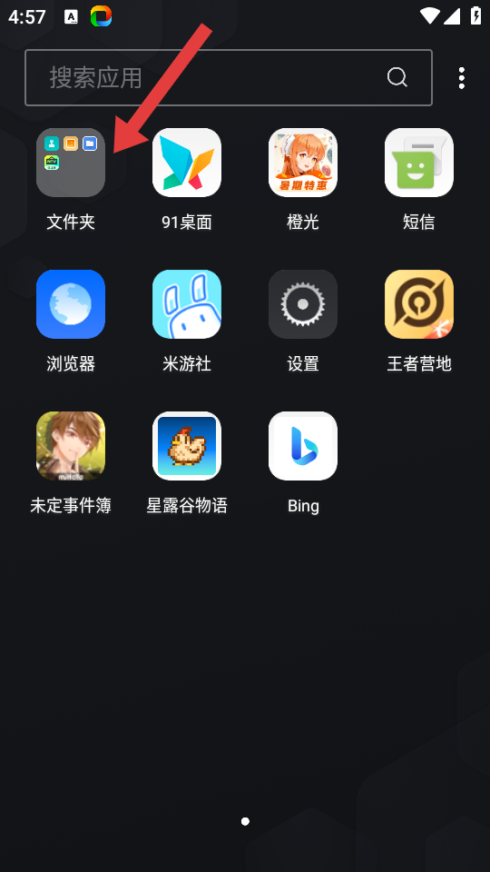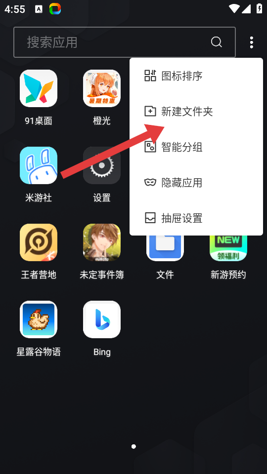 2、在应用列表页面右上角,点击三点菜单图标,在弹出的选项中选择新建文件夹。