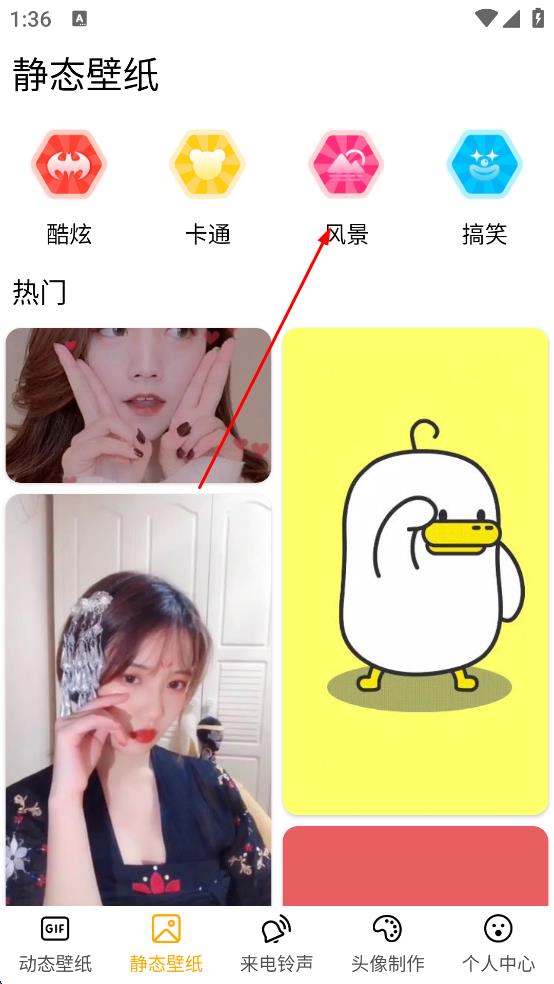 1、打开壁纸软件,进入静态壁纸界面,点击风景分类图标,浏览风景壁纸内容。