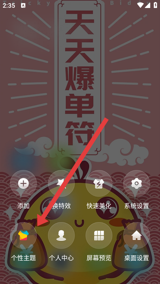 2、在弹出的操作菜单中,点击个性主题选项,进入主题/壁纸选择页面。