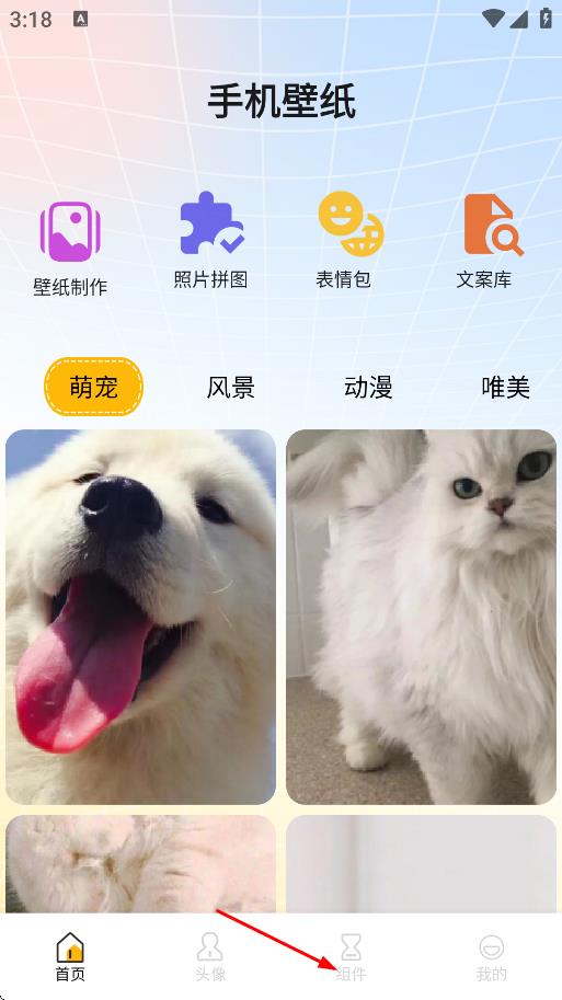 1、在手机壁纸页面,点击底部组件,进入主题组件页面。