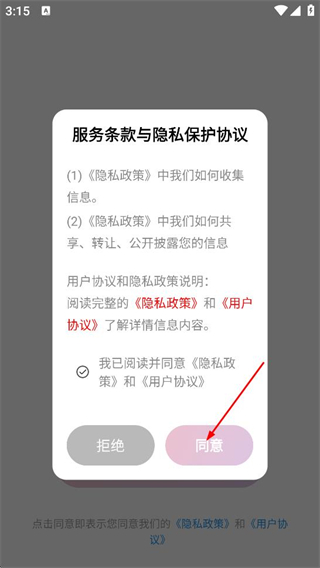 1、在服务条款与隐私保护协议弹窗中,点击同意的按钮,进入应用。