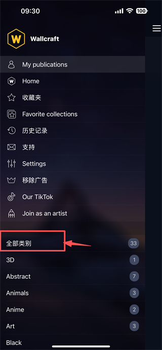 2、在菜单页面,点击全部类别选项,进入壁纸分类页面。
