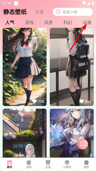 1、在静态壁纸页面,点击动漫分类标签,进入动漫类壁纸列表页面。