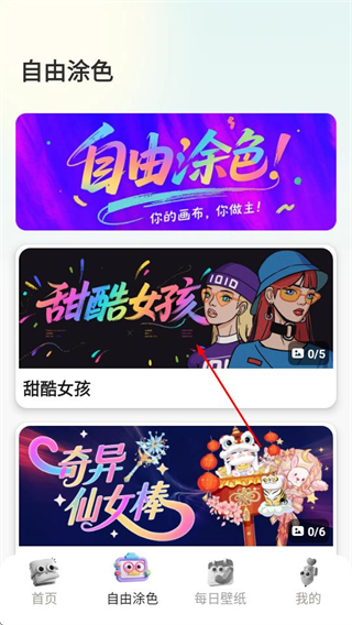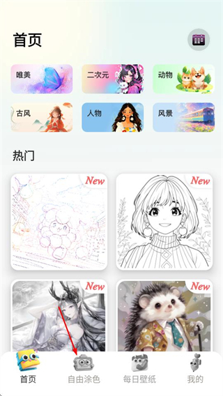 1、在软件首页,点击底部自由涂色选项,进入自由涂色页面。