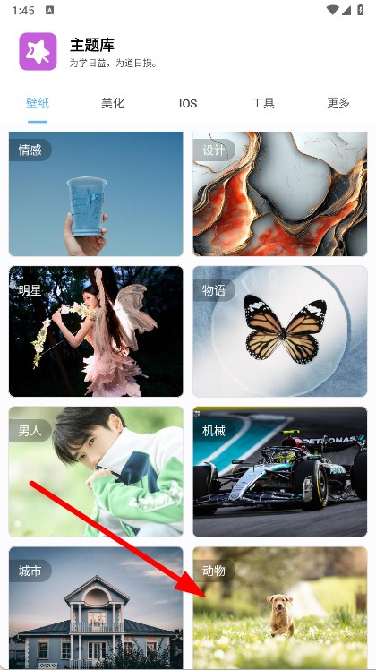 2、在壁纸选择页面,找到并点击动物分类,进入动物类壁纸展示页面。