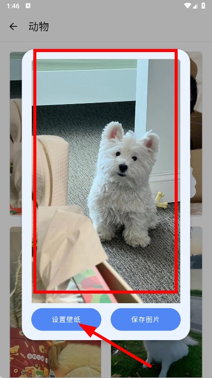 4、在弹出的壁纸操作窗口中,点击设置壁纸按钮,将所选动物壁纸设置为手机壁纸。