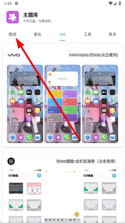 1、打开主题库APP,进入主界面后,点击壁纸选项,进入壁纸选择页面。