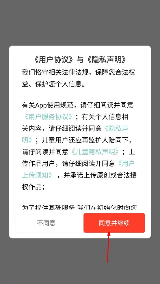 1、打开火萤App,弹出《用户协议》与《隐私声明》窗口,仔细阅读内容后,点击“同意并继续”,完成协议确认 。