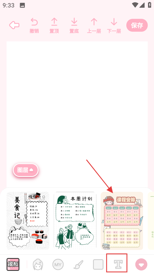 3、在创作页面,选择喜欢的模版,并点击文字图标。