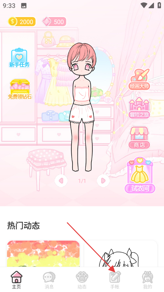 1、在主页,点击底部的手帐按钮,进入手帐模板页面。