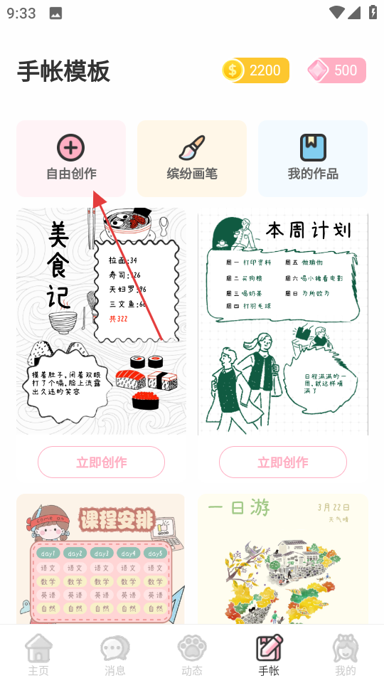 2、在手帐模板页面,点击自由创作,进入创作页面。