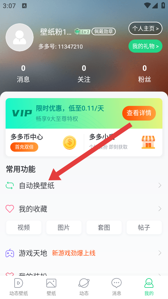2、在我的页面中,找到自动换壁纸的选项并点击,进入自动换壁纸设置的页面。