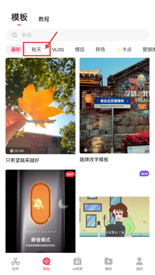 2、在模板推荐页面,点击秋天分类,浏览秋天主题模板列表。