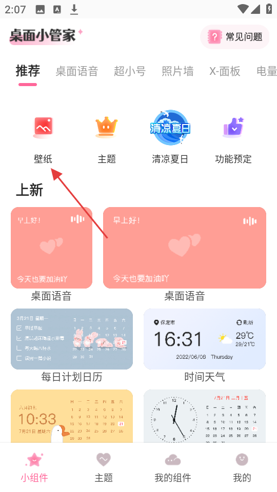 1、在桌面小管家页面,在首页点击壁纸选项。