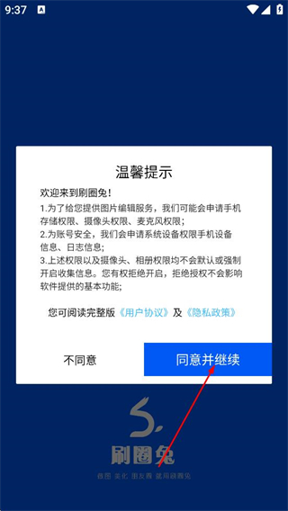 1、在温馨提示弹窗中,点击同意并继续,进入刷圈免应用页面。