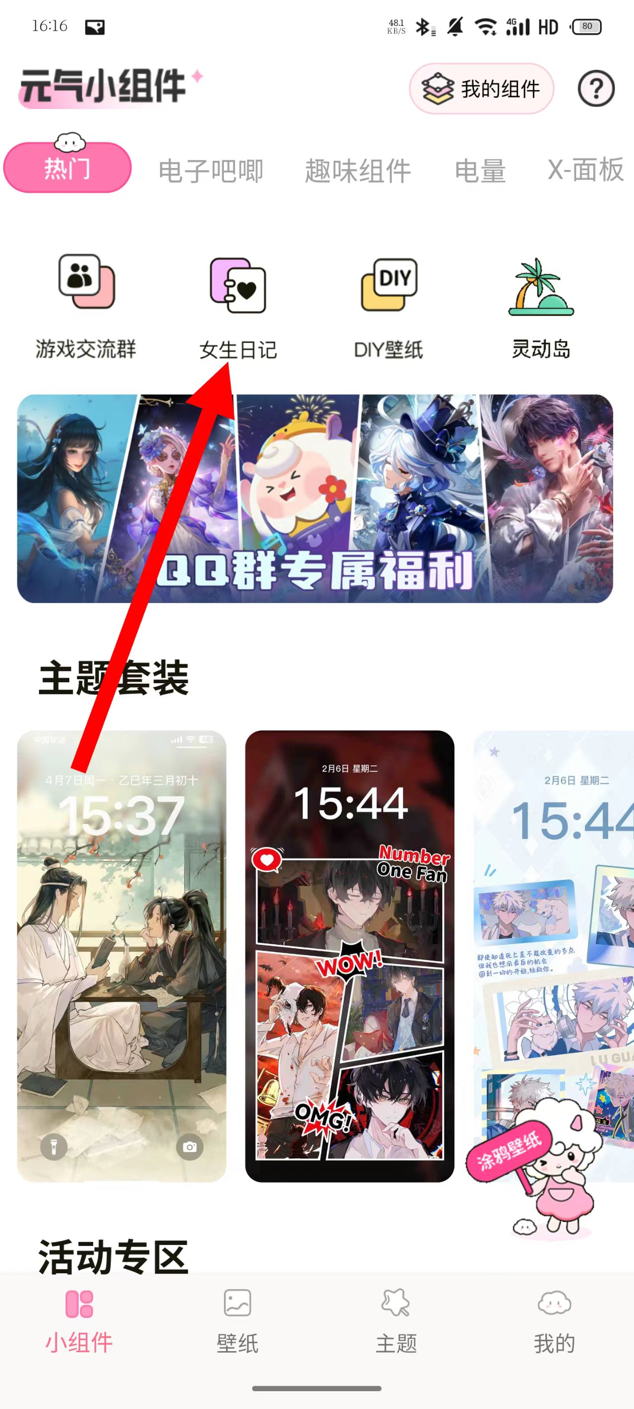1、打开APP,在首页点击女生日记选项,进入女生日记相关功能页面。