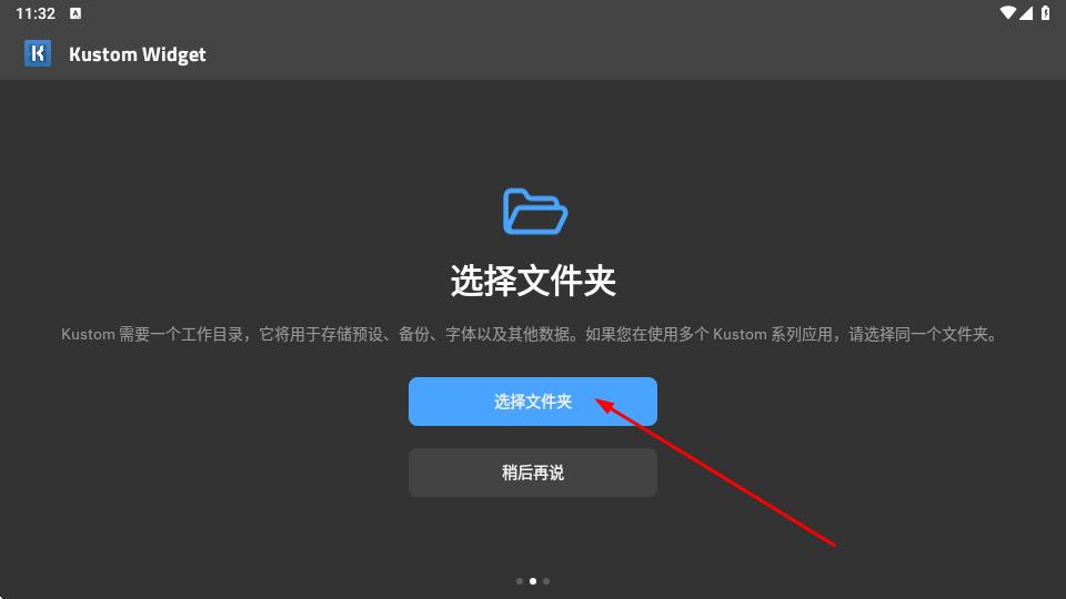 2、跳转至选择文件夹页面,应用弹窗说明需配置工作目录用于存储预设、备份、字体及其他数据,多应用场景建议复用文件夹,点击蓝色选择文件夹按钮,进入文件管理器界面。