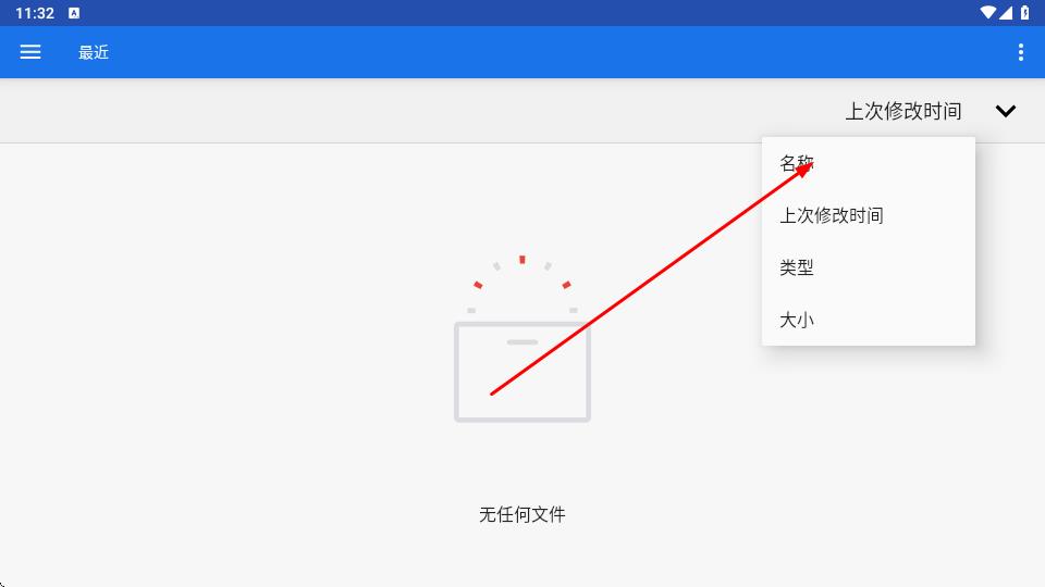 3、在文件管理器最近标签页,顶部蓝色导航栏右侧设有排序下拉菜单,可按名称、上次修改时间、类型、大小维度筛选文件,显示无任何文件、完成工作目录选择的前置操作。