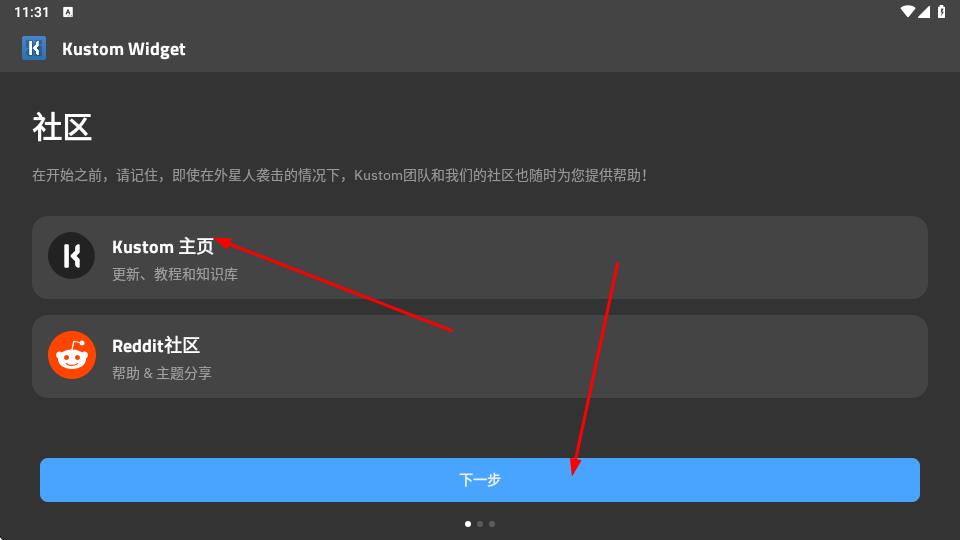 1、页面陈列Kustom主页集成更新、教程与知识库功能和Reddit社区支持帮助咨询与主题分享选项,点击底部蓝色下一步按钮,推进应用初始化流程。