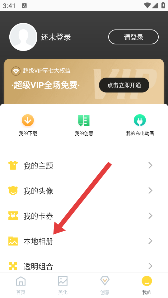 1、打开全局透明壁纸APP,进入我的页面,点击本地相册的选项,进入本地图片选择界面。